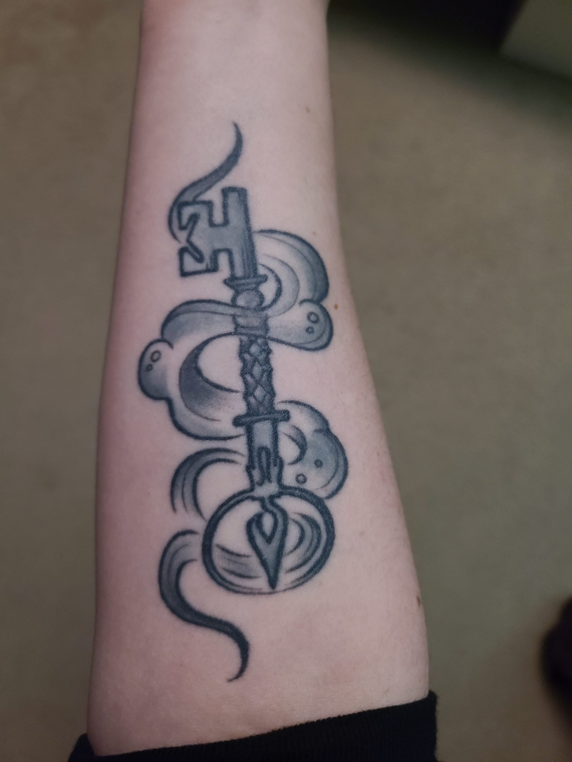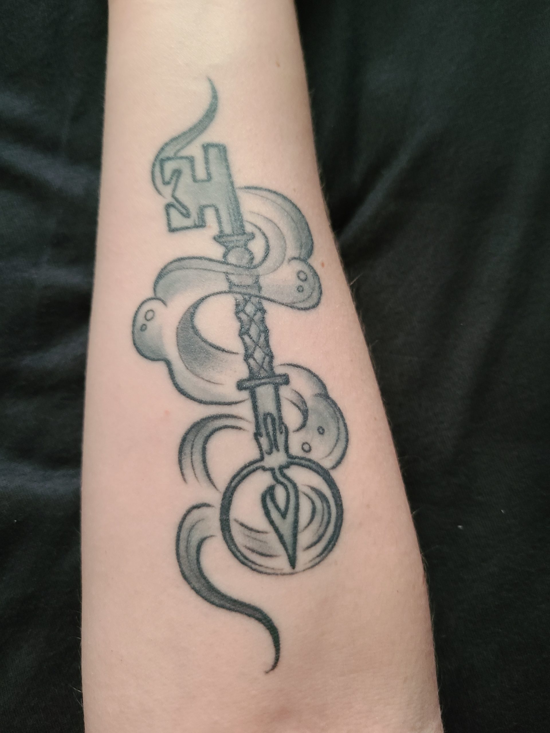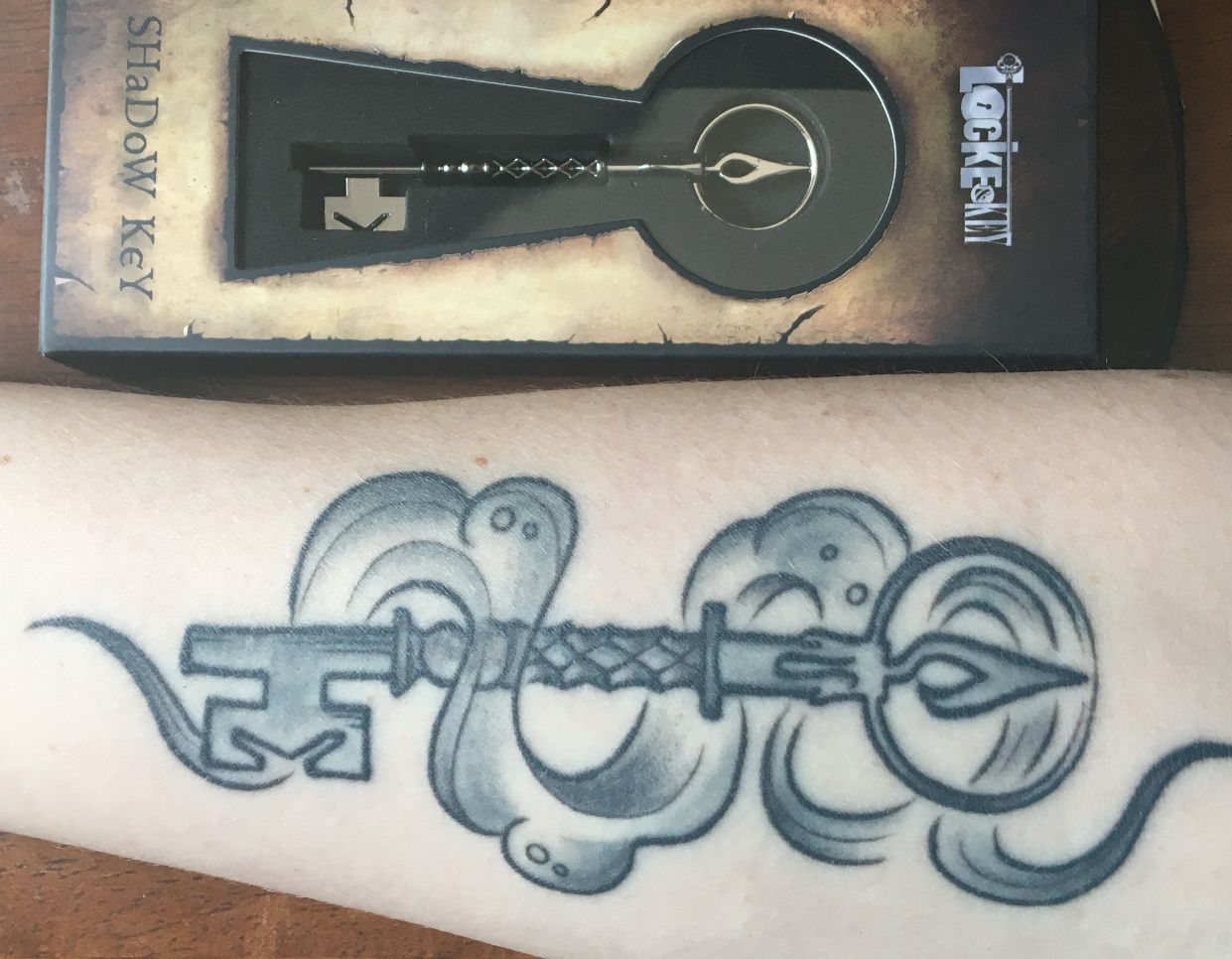 It’s been 2 years since I got my first tattoo. So I thought it would be fun to post some of the thoughts I’ve had on it. The tattoo is of the Shadow Key from the Locke & Key comics by Joe Hill. The tattoo was done by Kayla Faircloth at Scared Mandala. She did an amazing job.